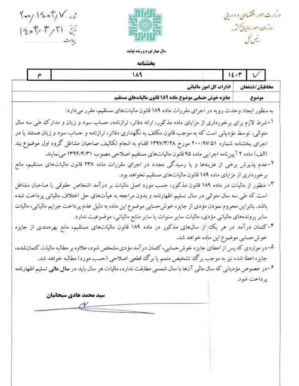 در این بخشنامه آمده است: به منظور ایجاد وحدت رویه در اجرای مقررات ماده ۱۸۹ قانون مالیاتهای مستقیم مقرر میدارد: